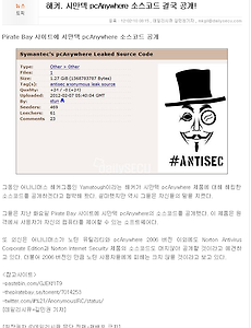 해커, 시만텍 PCAnywhere 소스코드 결국 공개! (Security, Symantec) 해커, 시만텍 PCAnywhere 소스코드 결국 공개! 결국 공개하는군요.. 시만텍은 무지 곤란하겠네요. 그래도 2006 버전이라 다행이네요. 여튼 해커는 알마나 시만텍이 싫었으면.. ㅋ; 2012. 2. 10.